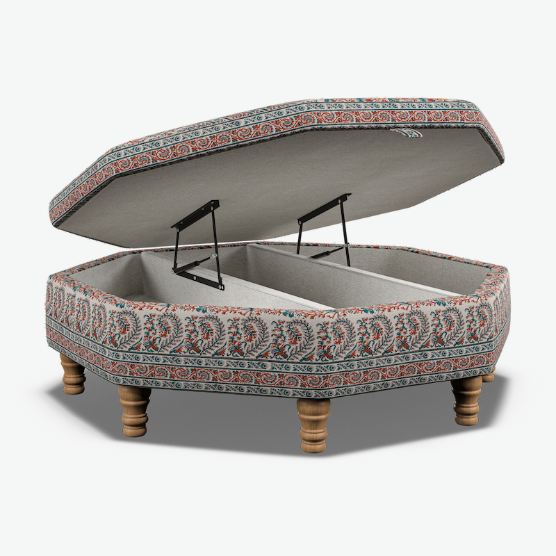 An elegant eight-sided octagonal ottoman with useful storage and provides the perfect place to show off a beautiful fabric.