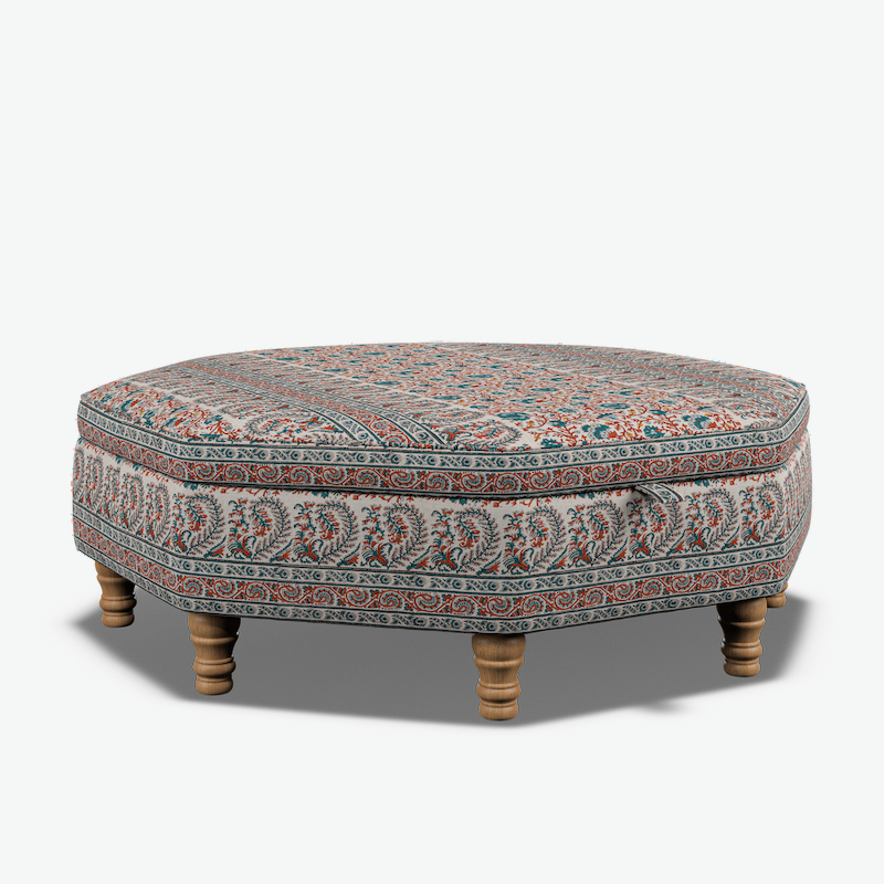 Pembrey Octagonal Storage Ottoman 121cm (48") in Ian Sanderson Mallow Border Cortez - Top Edge Self Piped - 12.7cm (5") Turned Leg Oak - No Trim